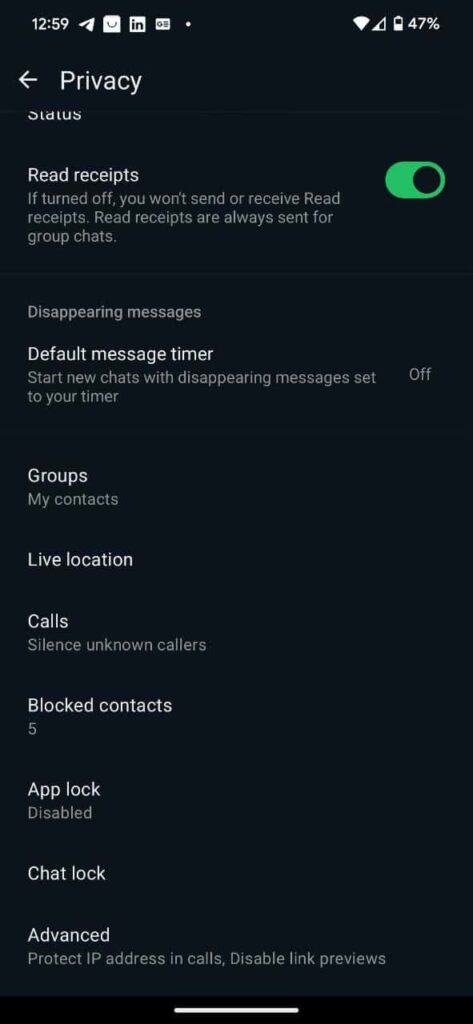 There, you can control who can see your last seen on WhatsApp. However, if you enable that feature, you will not see people’s last seen. In addition, you can set who can see your profile picture, status, and live location. There is an option to turn off read receipt, meaning no one would know when you read their message nor view status, but you won’t know who views your status either.