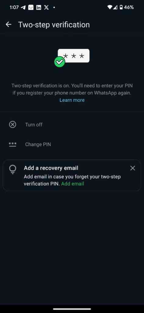 Not just your WhatsApp, if an app supports this option, you should be using it. This makes it impossible for someone to hack your account. In addition, you need the PIN when linking your account to a new device. Hence, someone can’t link your account to theirs without your consent.