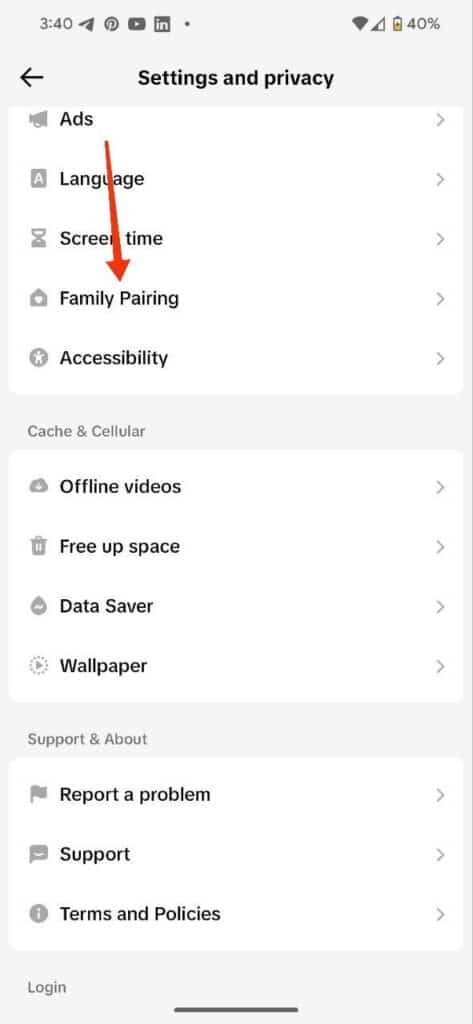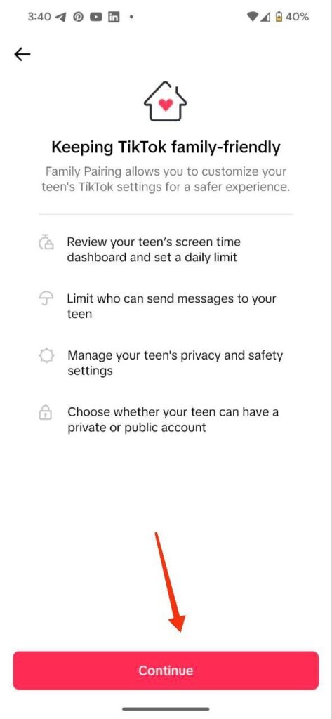 You can only monitor your child’s account after setting up family pairing. After setting the feature up, you can set time limits, who can send messages, pause push notifications, filter search by restricting some keywords, limit profile availability, and restrict comments and likes on their content.